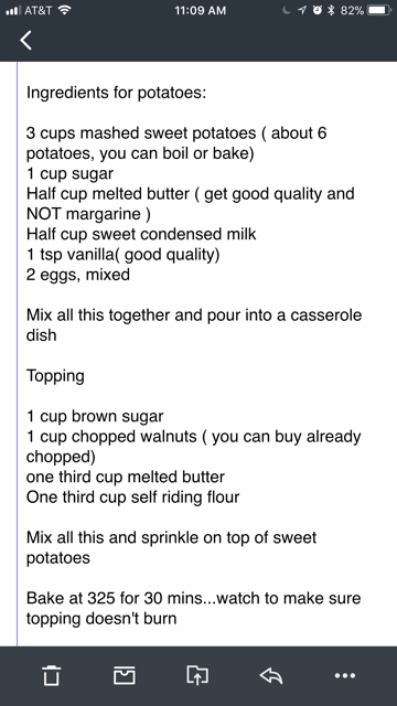 Now, I used to HATE, like HATE sweet potatoes but ever since my mom switched over from the usual sliced up yams dosed in cinnamon and sugar and started making this casserole, I have been hooked ever since! I always forget the ingredients so I asked my Mom to send it over to me - Now, if you don't have a recipe that is half-ass'd sent to you that you need to decipher, is it really a family recipe!? See below lol.. I was like Mom, what?