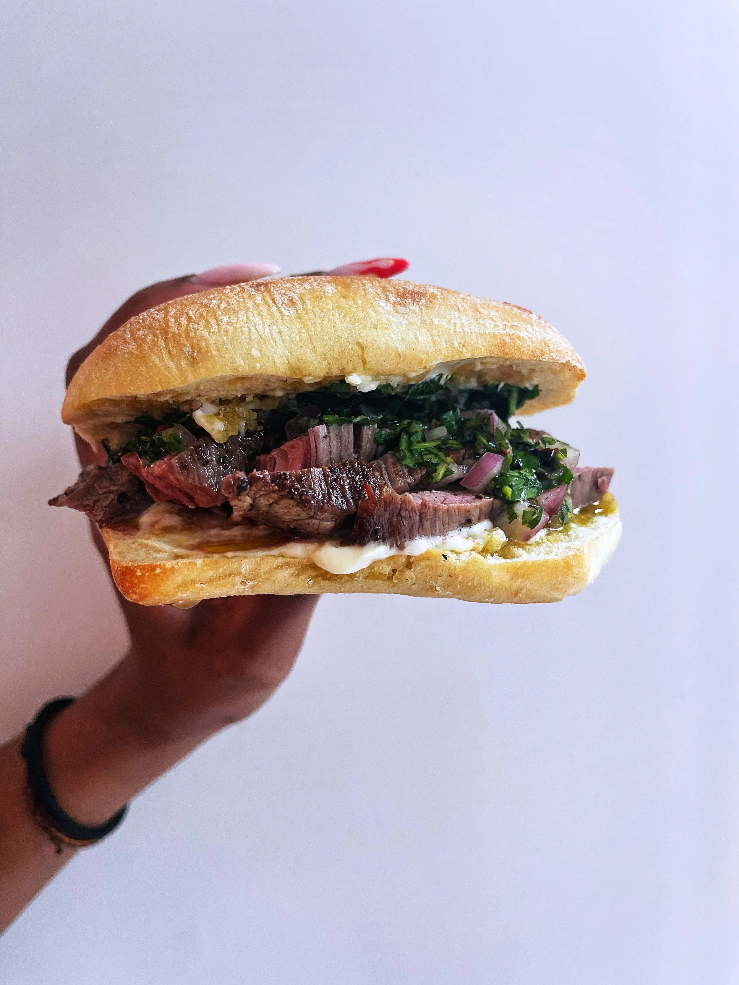 For the steak sandwich, toast the bread, shmear on the roasted garlic mayo, top with perfectly cut steak and all the chimichurri you want! ENJOY!